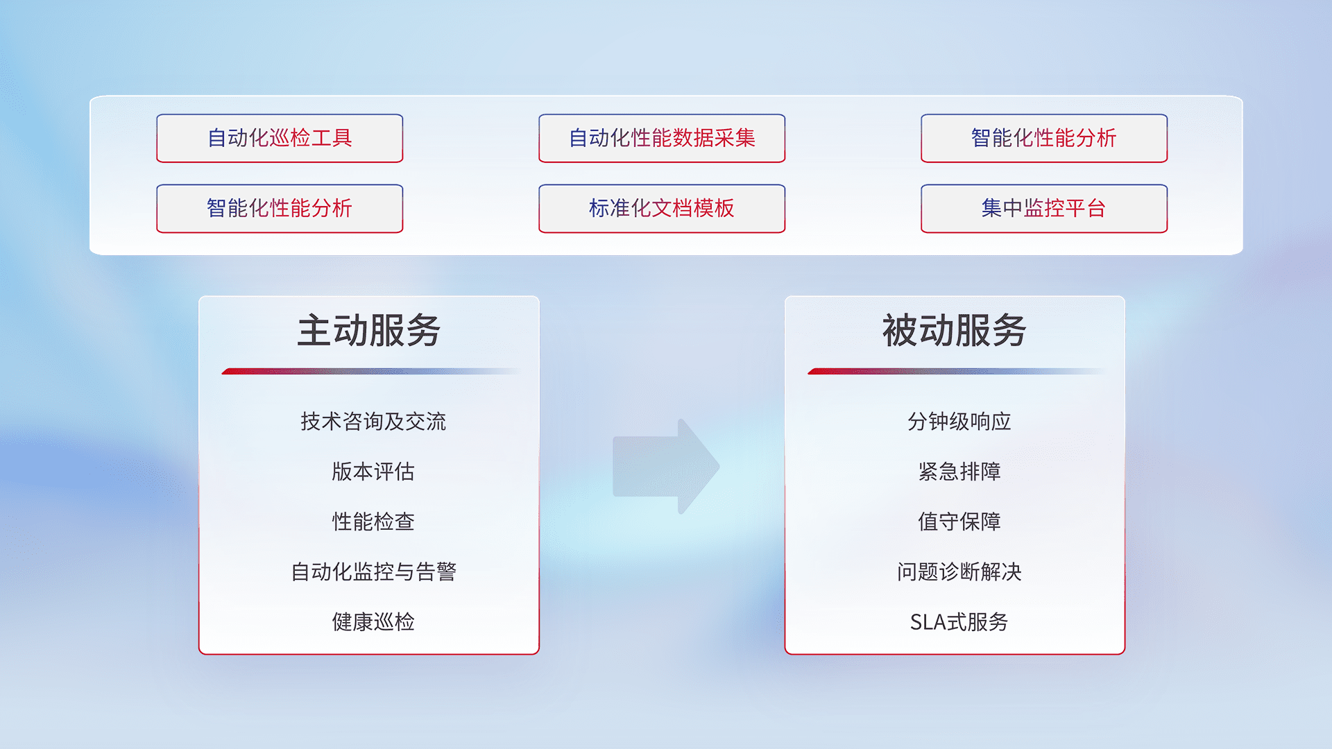 智能化工具和标准化文档,,,保障服务质量,,,提供主动服务(包含技术咨询、、、、版本评估、、、、性能检查、、、自动化监控与告警、、、健康巡检)和被动服务包含(分钟级响应、、、、紧急排障、、、、值守保障、、、、问题诊断解决、、SLA服务)。。。。